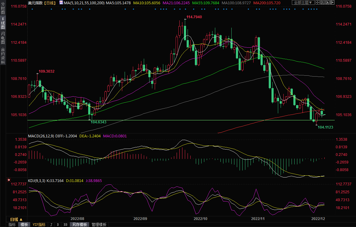 美元指数窄幅震荡,目前交投于105.19附近;美元周三下跌,人们担心利率上升可能将美国经济推向衰退,亚洲大国放松新冠限制打压美元的避险需求。