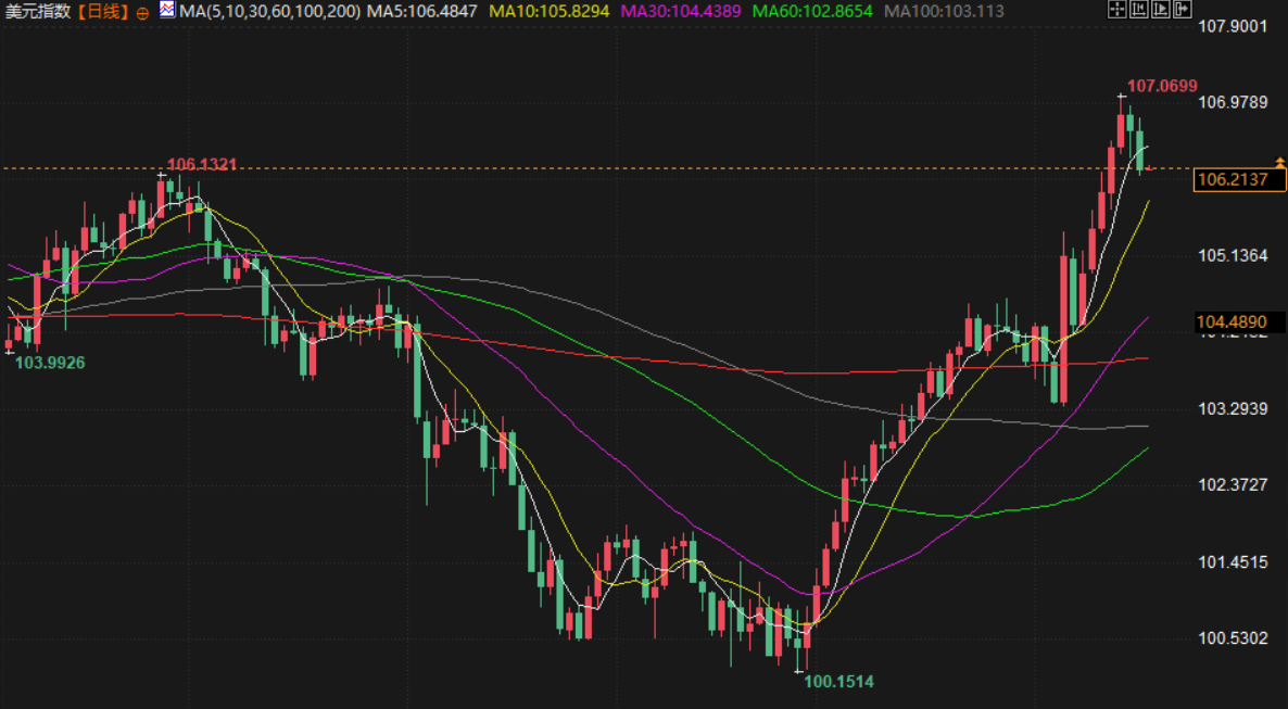 美元指数上周创下107.07的一年多新高,并且一直在上涨,因人们预期特朗普获胜可能导致关税提高,并有可能刺激通胀,从而减缓美联储的降息步伐。