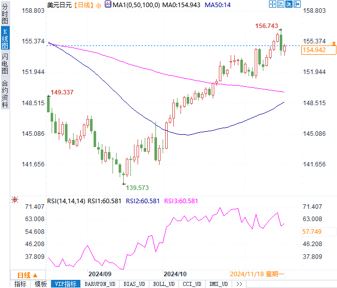 日元继续承压美元兑日元延续涨势,日本央行行长植田和男表示将逐步加息,但对时机保持模糊态度。市场目前预计日本央行在12月加息25个基点的概率约为55%。日本财务大臣此前表示若日元快速贬值可能干预汇市,这一表态对市场情绪影响有限。