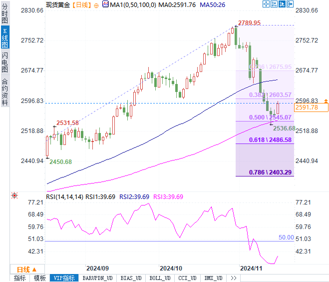 现货黄金价格上涨1.19%,报2592.01美元/盎司,扭转了此前六连跌的趋势。上周金价创下三年来最大单周跌幅,因美元持续走强和市场对美联储放松货币政策预期的降温导致避险情绪减弱。