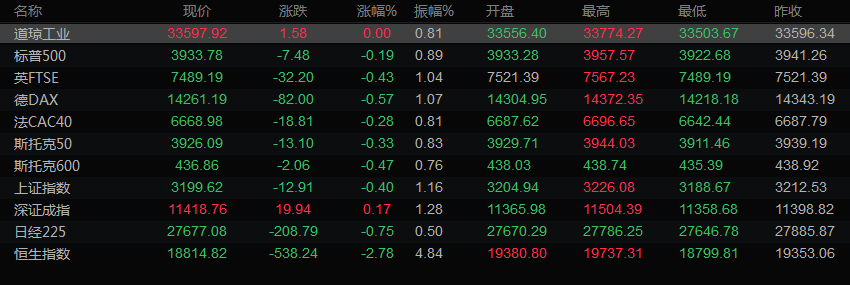 美股收盘情况:道琼斯指数收盘上涨0.53点,报33596.87点;