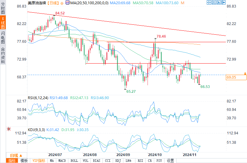 市场预测:看跌前景占上风原油价格近期可能面临下行压力。俄罗斯石油公司(Sverdrup)的供应复苏和需求低迷,再加上美元走强,超过了地缘政治风险和持续停电的看涨因素。市场预计将继续承受抛售压力,并倾向于看跌。