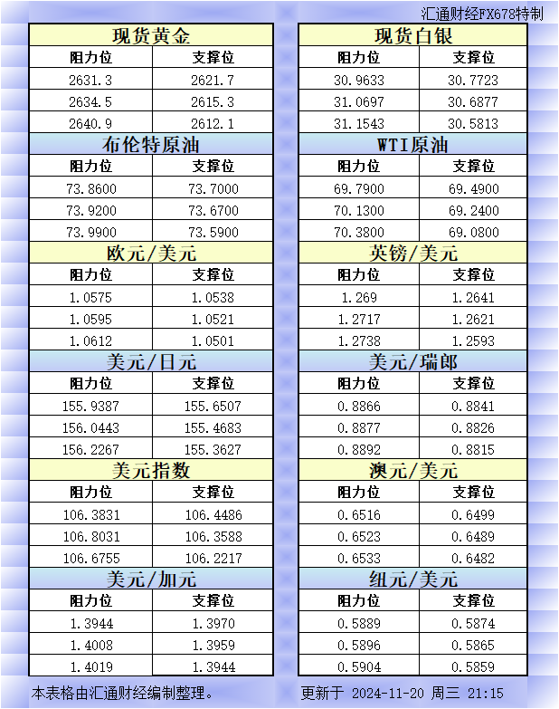 标题:11月20日美市更新的支撑阻力:金银原油+美元指数等八大货币对