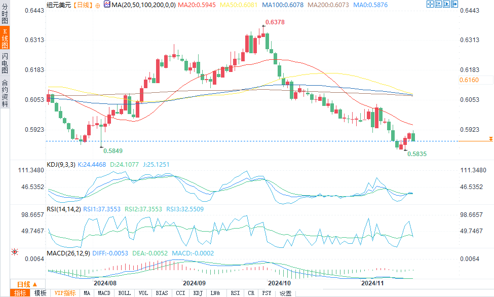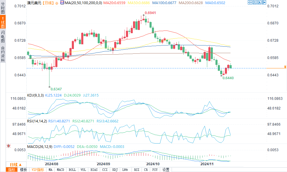 澳元方面,市场预计澳洲联储不会在12月降息,但预计2025年将有两次降息。澳大利亚经济数据依然稳健,而通胀继续缓慢下降,使澳洲联储保持中立立场。