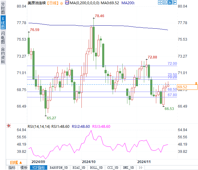美原油上涨0.35%,至69.48美元/桶。本轮涨势主要受到地缘政治风险的驱动。近日,乌克兰使用美制导弹袭击俄罗斯边境地区后,俄罗斯更新核武政策,并威胁对任何进一步挑衅采取强硬措施。这种紧张局势加剧了市场对能源供应中断的担忧,推动油价走高。