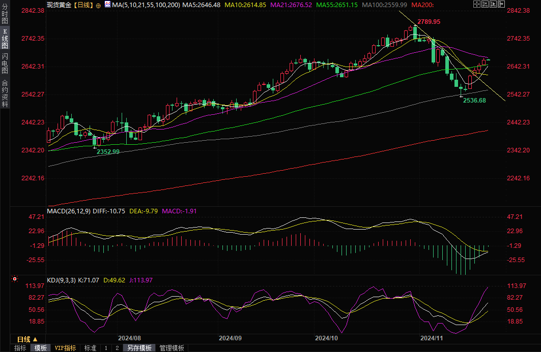 现货黄金窄幅震荡,目前交投于2669.18美元/盎司。金价周四连续第四个交易日上涨,最高触及2673.38美元/盎司,为近两周新高,因俄罗斯使用高超音速中程弹道导弹向乌克兰一处军事设施发动了打击,并警告西方,使得市场对俄乌紧张局势的担忧情绪升温,导致避险需求飙升。对国际贸易局势的担忧也推升黄金的避险买需。