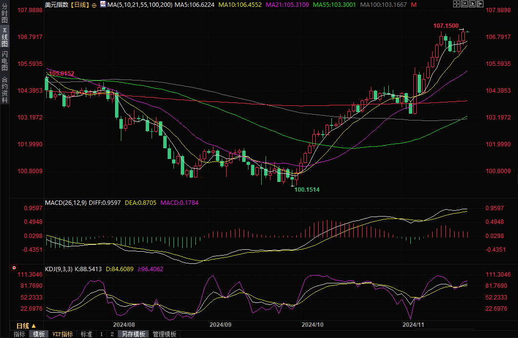 美联储主席鲍威尔等决策者最近发表的评论表明,联储可能会在降息道路上走得更慢一些,而对特朗普的政策可能会重燃通胀的担忧则助推美元升至107.15的高位,这是自2023年10月4日以来的最高水平。