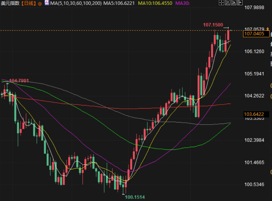 美元周四在震荡交投中升至107.15,创自2023年10月4日以来的最高水平,投资者评估美国最新劳动力市场数据和美联储官员对利率走势的评论。以及对特朗普的政策可能会重燃通胀的担忧则助推美元上涨。上周初请失业金人数减少6000人,经季节性调整后为21.3万人,创七个月新低,低于接受路透调查的经济学家预计的22万人,暗示就业增长在上月因飓风和罢工而突然放缓后,很可能在11月出现反弹。然而,该报告也表明劳动力市场存在闲置,因为失业者需要更长的时间才能找到新工作,失业人数增至三年来的最高水平,为美联储在12月再次降息提供了缓冲。