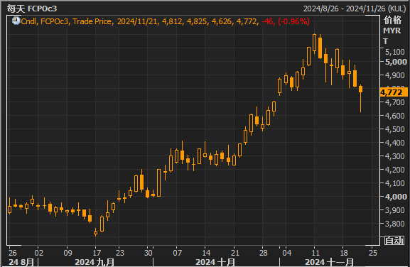 周四(11月21日),棕榈油期货市场延续疲弱走势。马来西亚衍生品交易所的2月棕榈油期货基准合约下跌46林吉特,收于每吨4769林吉特(约合1069.28美元),跌幅0.96%。继前一交易日大幅下跌2.21%后,市场继续受到多个利空因素的打压,包括对主要经济体贸易政策的担忧和需求疲软。