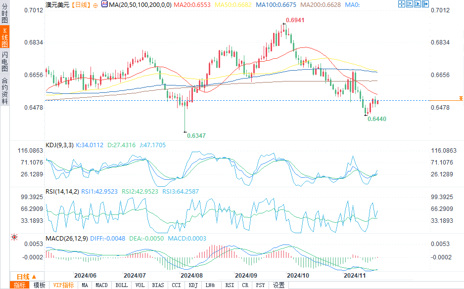 日线图显示澳元/美元汇率在过去的几个月里一直处于下降趋势之中。在本周试图反弹后,澳元/美元在0.6530遇到强大阻力。