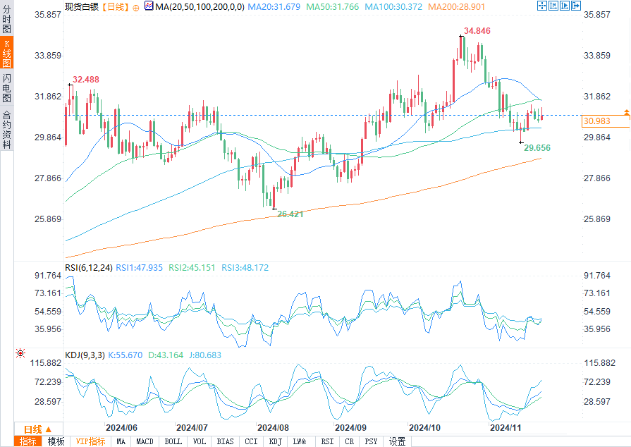 美联储利率预期仍是推动银价上涨的重要因素。CME的美联储观察工具暗示,美联储可能在12月降息25个基点,这可能为贵金属提供支撑。然而,美联储官员如古尔斯比的鸽派言论带来了不确定性,因为任何延迟降息都可能限制白银的上行空间。