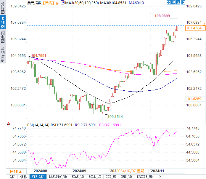 美元指数报107.4434,日内上涨0.36%,接近2023年10月以来高位。本周贵金属市场强势反弹,