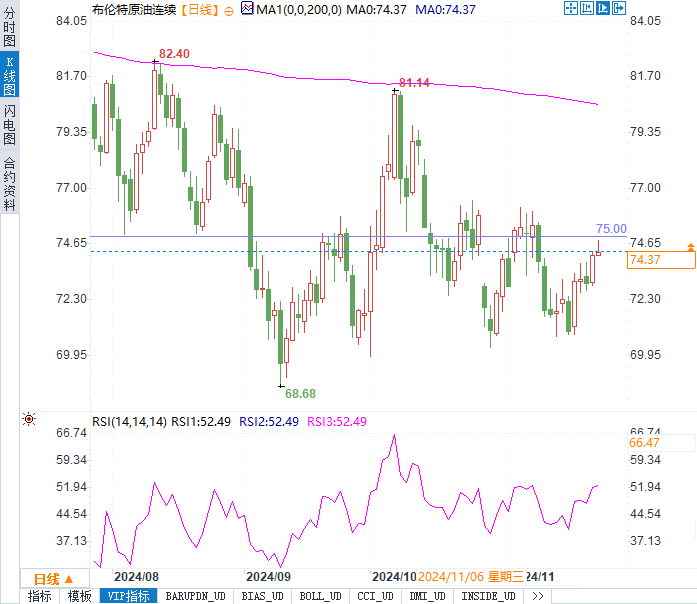 布伦特原油和WTI原油在连续上涨后接近关键阻力位,若能突破当前水平,可能进一步挑战75美元和72美元的整数关口。然而,若地缘政治风险缓解或库存数据超出预期,油价可能面临短期回调压力。