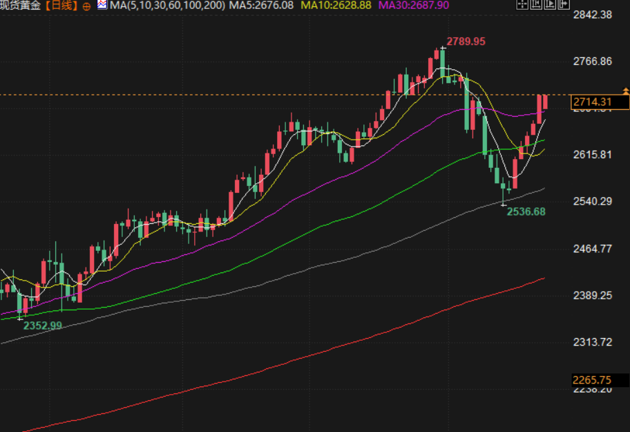 现货黄金交投于2714美元/盎司附近,金价近期走势受助于避险情绪浓烈的支撑,本周金价关注地缘局势和美联储利率决议相关观点;
