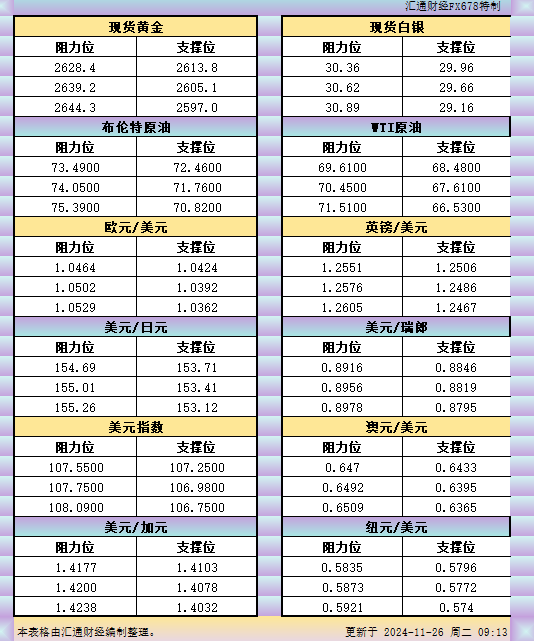 标题:11月26日亚市支撑阻力:金银原油+美元指数等六大货币对