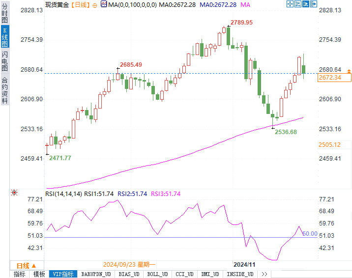 现货黄金价格日内下跌1.61%,交投于2670.57美元/盎司,此前一度触及三周高位。获利了结与贝森特提名带来的避险情绪减弱是主要驱动因素。市场普遍认为,贝森特在财政和贸易政策上的温和立场将有助于降低紧张局势,从而抑制黄金的避险需求。