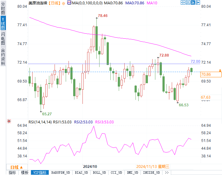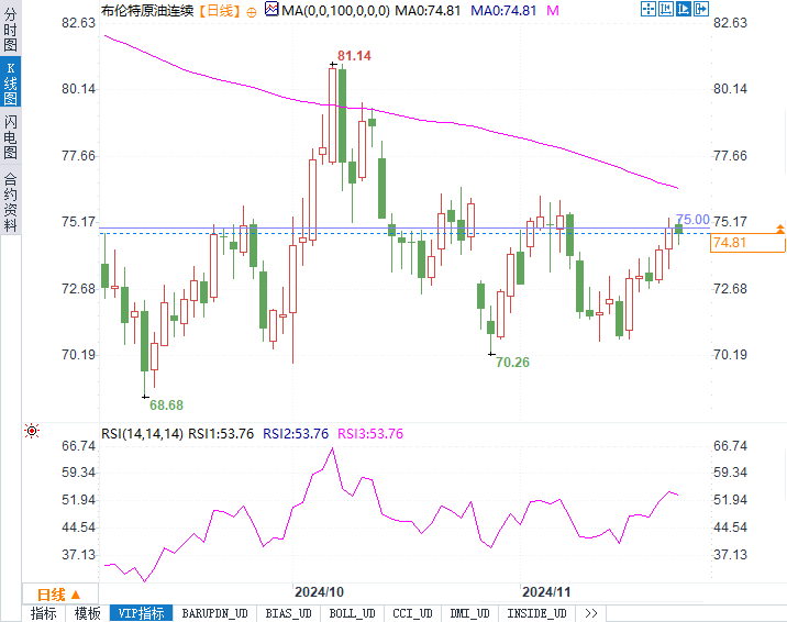 美原油分别交投于74.78美元/桶和70.82美元/桶,日内分别下跌0.38%和0.59%。尽管上周油价录得6%的大幅上涨,但市场进入本周后出现小幅回调,因投资者等待更多地缘政治和供应面的指引。