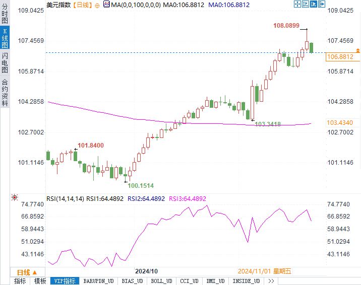 美元指数在过去八周持续上涨,但周一出现显著回落,目前交投于106.9160,技术指标显示其上涨已接近超买区间。市场对特朗普提名知名投资人斯科特·贝森特为财长的消息作出积极反应,因其被视为财政保守派,有望抑制财政赤字的过度扩张。这一提名缓解了债市投资者的担忧,导致10年期美债收益率下滑至4.343%,间接削弱了美元的利差优势。