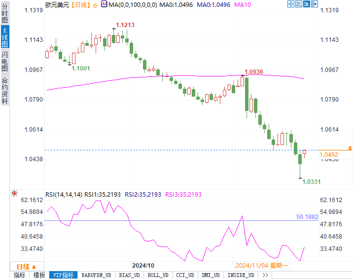欧元兑美元上涨0.74%,至1.0492,从上周低点1.0332反弹。市场预期欧洲央行将在12月的政策会议上降息50个基点,鸽派情绪已在汇市得到充分反映,欧元短期可能进入技术性修正阶段。