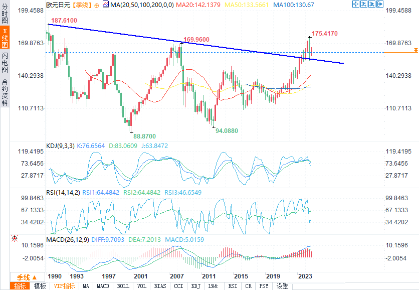 上行方面,升破175.40高点可能会扩大涨幅至188.20,这是1979-2000年下跌趋势的50%斐波那契回撤位,并有进一步走向208的潜力,与61.8%斐波那契回撤水平一致。
