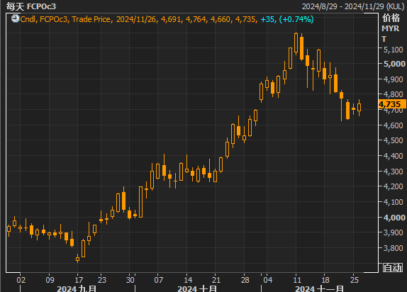 汇通财经APP讯——棕榈油期货市场在本周二(11月26日)表现出连续第二日上涨趋势,马来西亚衍生品交易所基准棕榈油期货(FCPOc3)2月交割合约收涨35马币(约0.74%),报每吨4,734马币(折合1,062.63美元)。这一涨势主要受到竞争产品豆油价格走强以及马来西亚产量预期下降的推动。