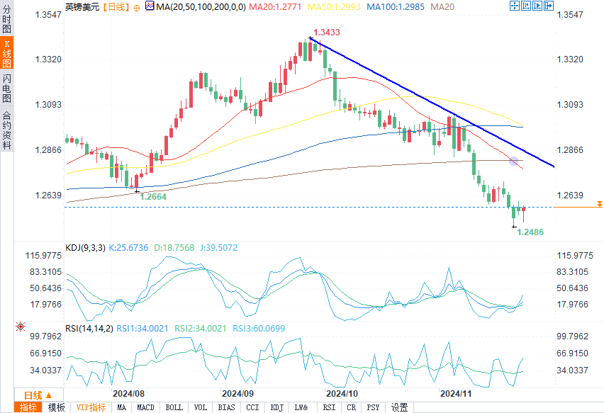 英镑/美元从1.3433水平回落后,连续第八周下跌,跌幅超过7%。上周五,英镑/美元创下六个月新低1.2486,触及长期上升趋势线。