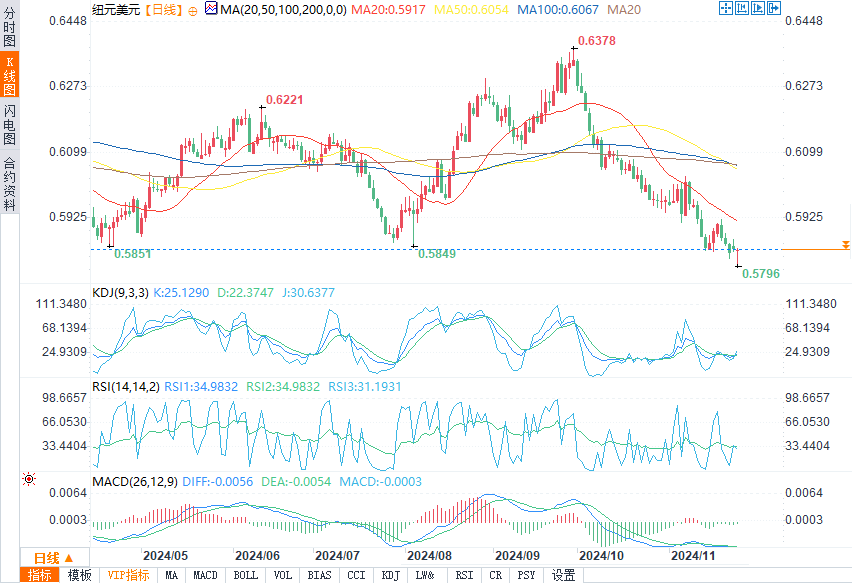 纽元/美元是另一组受到打击的货币对,在从0.5800下方反弹之前,曾短暂触及2024年低点。纽元被困在下跌趋势中,势头完全与空头有关,确保了在出现明显的卖出信号之前,市场仍然倾向于反弹卖出。空头可以在接近下行趋势时建立,并在上方设置止损以进行保护。在今天早些时候创下的低点之外,0.5774是一个潜在目标。