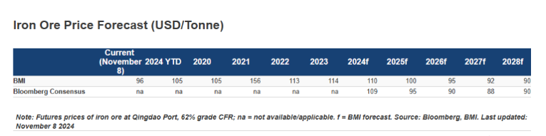 根据长期预测,BMI预计铁矿石价格将从2024年每吨110美元的平均水平逐步下降至2033年的每吨78美元水平。虽然这一价格显著低于2021年的每吨156美元,但BMI预测,2024至2028年的年度均价为每吨97美元,将仍高于2016至2020年的每吨78美元。