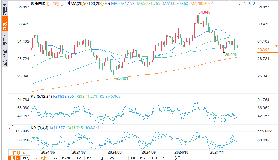 周三(11月27日)欧盘时段,银价盘中守在30.4美元/盎司附近,个人消费支出(PCE)通胀数据在内的重要美国经济报告出炉前市场情绪谨慎。市场仍在关键技术区间内,暗示近期阻力位和支撑位,交易商正密切关注。
