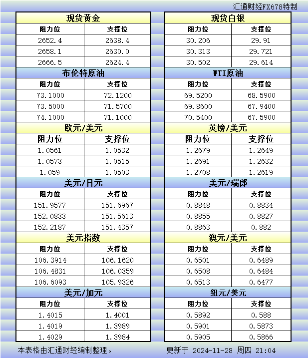 标题:11月28日美市更新的支撑阻力:金银原油+美元指数等八大货币对