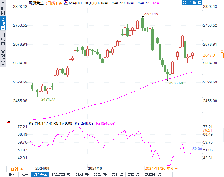 现货黄金上涨0.48%,至2647.28美元/盎司,美国12月降息预期成为主要推动力。随着最新公布的美国通胀数据低于预期,市场对美联储12月降息25个基点的押注升至68.2%,进一步支撑黄金作为避险资产的吸引力。