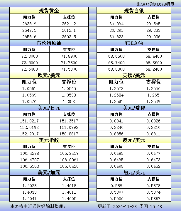 11月28日欧市更新的支撑阻力:金银原油+美元指数等八大货币对