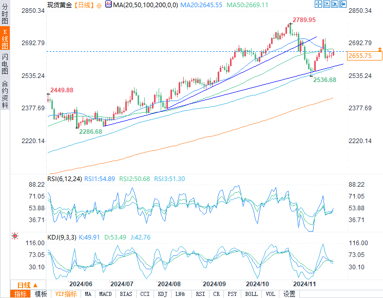 金价近期可能维持区间震荡,阻力位在2,669.53美元,支撑位在2,605.31美元。美元走弱或地缘政治紧张局势升级可能会推高价格,但美元走强和利率预期上升可能会限制上涨潜力。黄金前景仍谨慎看跌,交易商将经济数据和政策信号与地缘政治风险进行权衡。