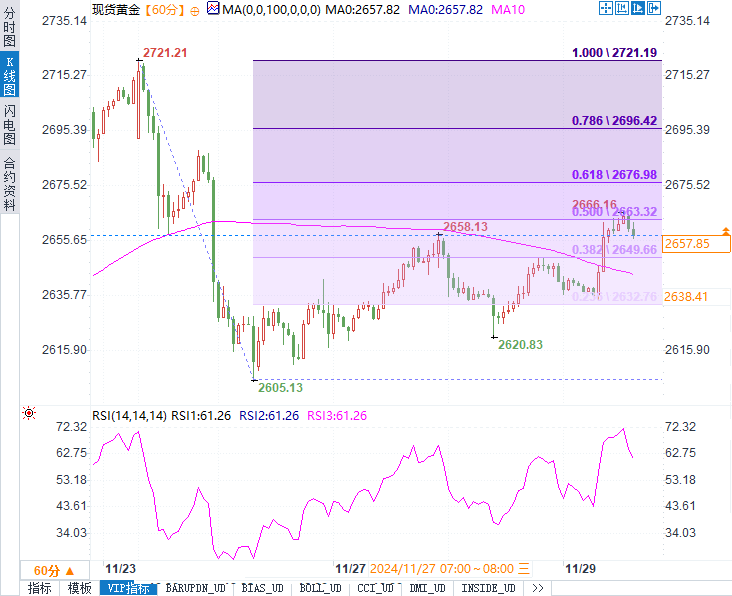 从技术面来看,黄金价格在短期内突破了多个技术阻力位,尤其是在2649-2650区间。该区域是100小时简单移动平均线(SMA)和38.2%斐波那契回撤位的交汇点,这一突破被视为看涨信号。随后的涨势尽管有所放缓,但金价仍然维持在相对较高的位置,受到了50%斐波那契回撤位(约2663-2664)的支撑。