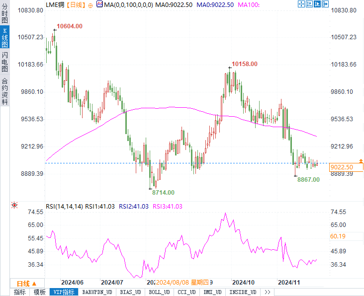 美元指数当日下跌0.3%,为铜价提供一定支撑。美元走弱通常利好以美元计价的商品,因为其对其他货币持有者变得更为便宜。然而,这一利好难以掩盖市场对需求的忧虑。美国总统当选人特朗普可能进一步施加关税的言论,令市场对经济增长和金属消费的前景感到担忧。与此同时,需求相关的担忧也使铜价承压。