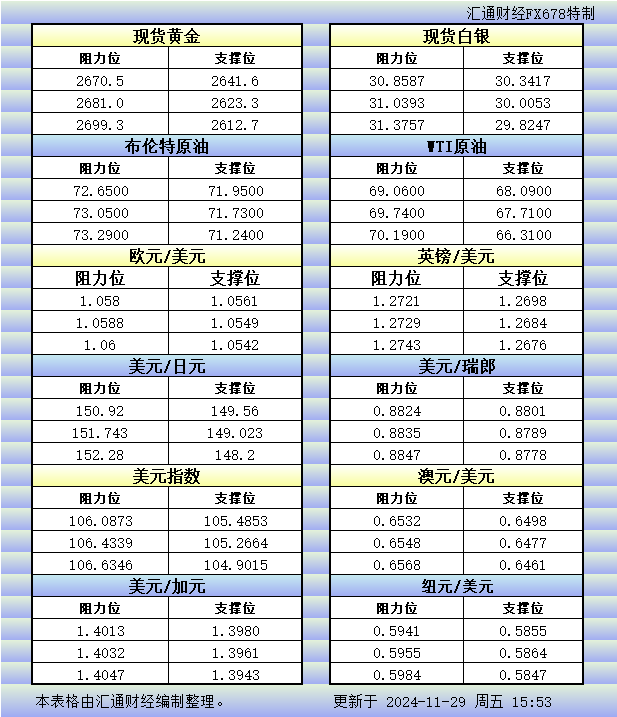 11月29日欧市更新的支撑阻力:金银原油+美元指数等八大货币对