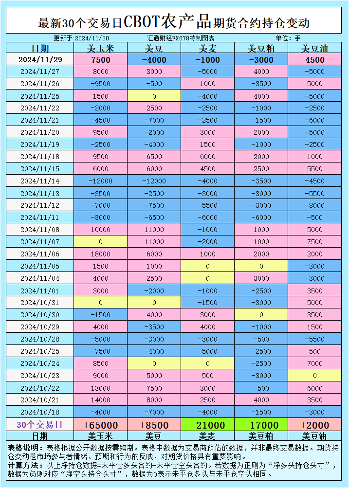 增加CBOT玉米投机性净多头;增加CBOT大豆投机性净多头;增加CBOT小麦投机性净空头;增加CBOT豆粕投机性净空头;增加CBOT豆油投机性净多头。