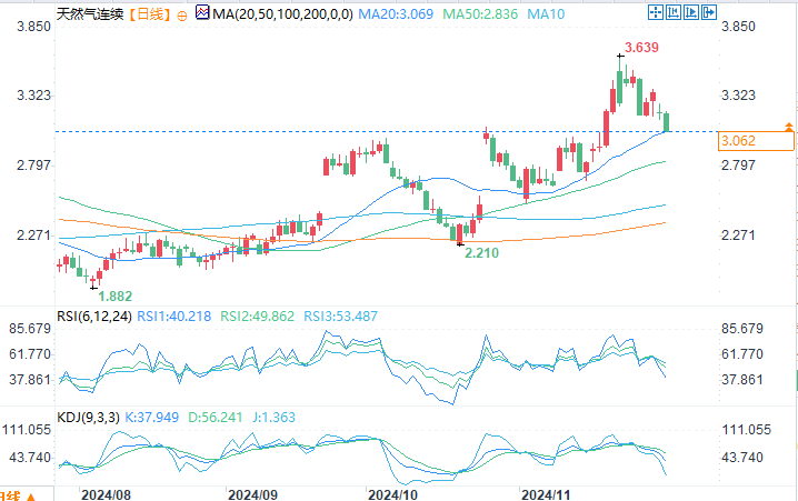 周二(12月3日)美盘时段,天然气期货价格下滑,跌破50日移动均线3.142美元,在测试了50%的回撤位后,支撑位为3.118美元。这一下行压力反映了12月中旬天气预报变暖以及生产水平上升的影响,这些影响超过了目前影响美国的寒冷天气。