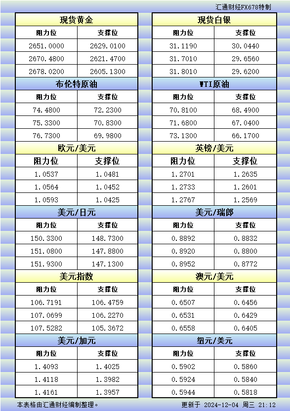 标题:12月4日美市更新的支撑阻力:金银原油+美元指数等八大货币对