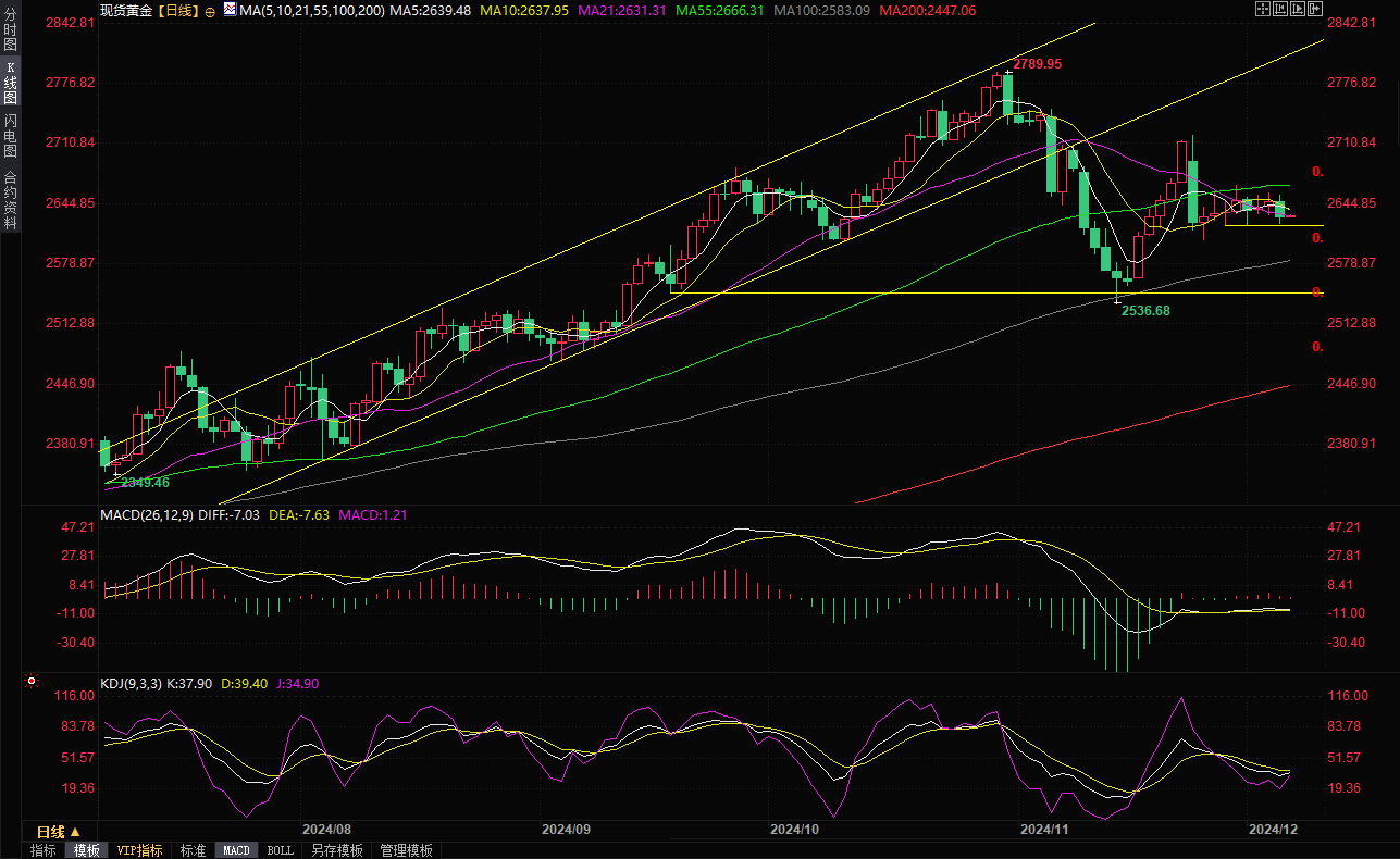 现货黄金窄幅震荡,目前交投于2633.65美元/盎司附近。金价周四下跌0.68%,盘中最低跌至2623.46美元/盎司,接近上周四创下的近一周低点2620.83附近支撑,原因是美国上周初请失业金人数系列数据公布后,市场对美联储12月降息预期小幅降温。不过,金价跌幅受限,一是受到地缘局势支撑,二是市场仍在等待美国非农就业数据,以了解美联储的降息立场。