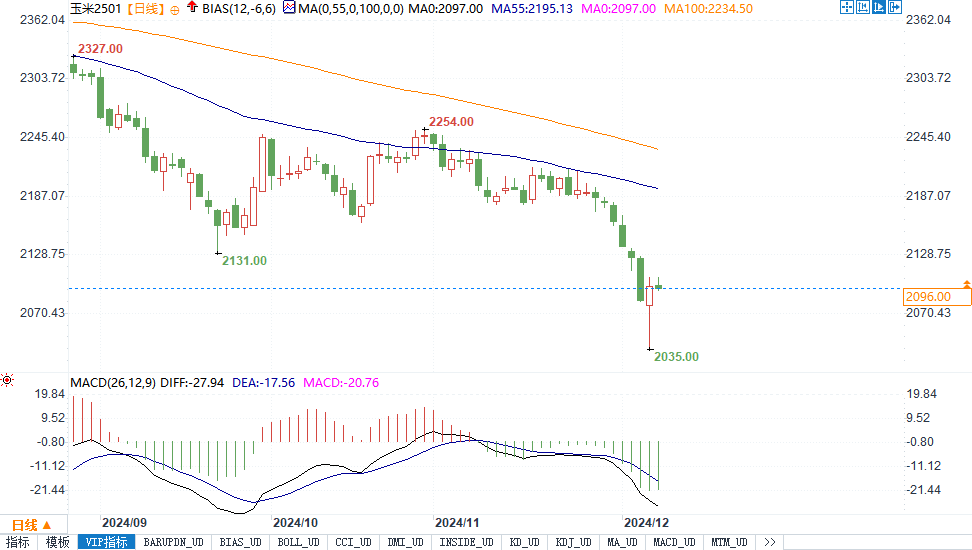 北京时间12月5日21:23,玉米01合约报2096元/吨。