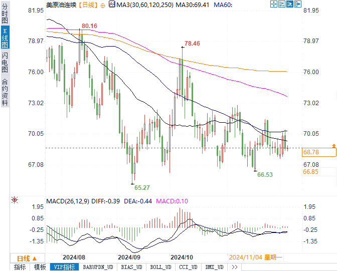 美原油交投于68.79美元/桶,涨幅为0.36%。市场等待OPEC+关于产量政策的决定。