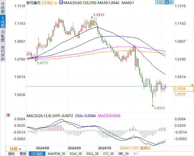 欧元兑美元今日继续反弹,接近11月底的两年低点1.0332美元上方。市场逐渐消化法国政治危机对欧元区经济的影响,同时对欧洲央行的进一步宽松政策已有预期。交易员预计,下周欧洲央行将降息25个基点,而市场押注的全年宽松幅度已达157个基点。