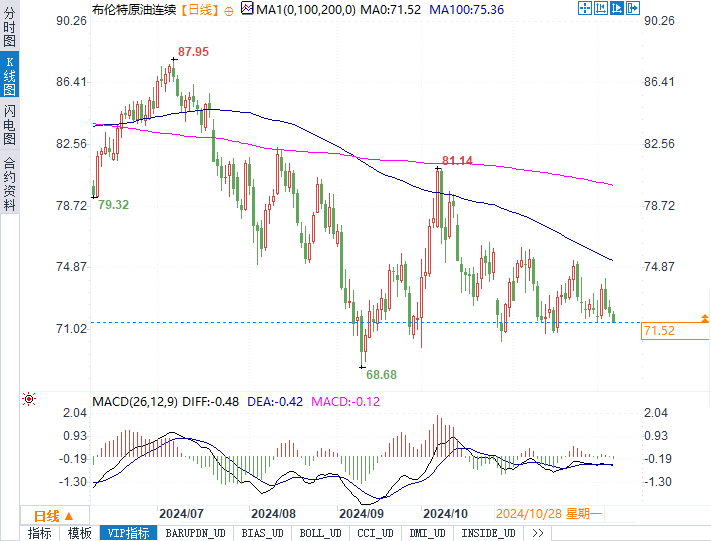 布伦特原油连续合约交投于71.58美元/桶,日内下跌0.77%;