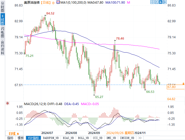 美原油连续合约报67.87美元/桶,日内跌幅0.63%。油价近期跌至关键区间下沿,逼近多年均线支撑位(100月移动平均线)。若