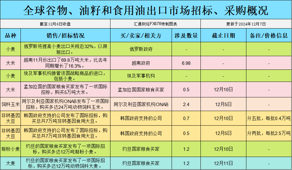全球谷物、油籽和食用油出口市场招标、采购概况: