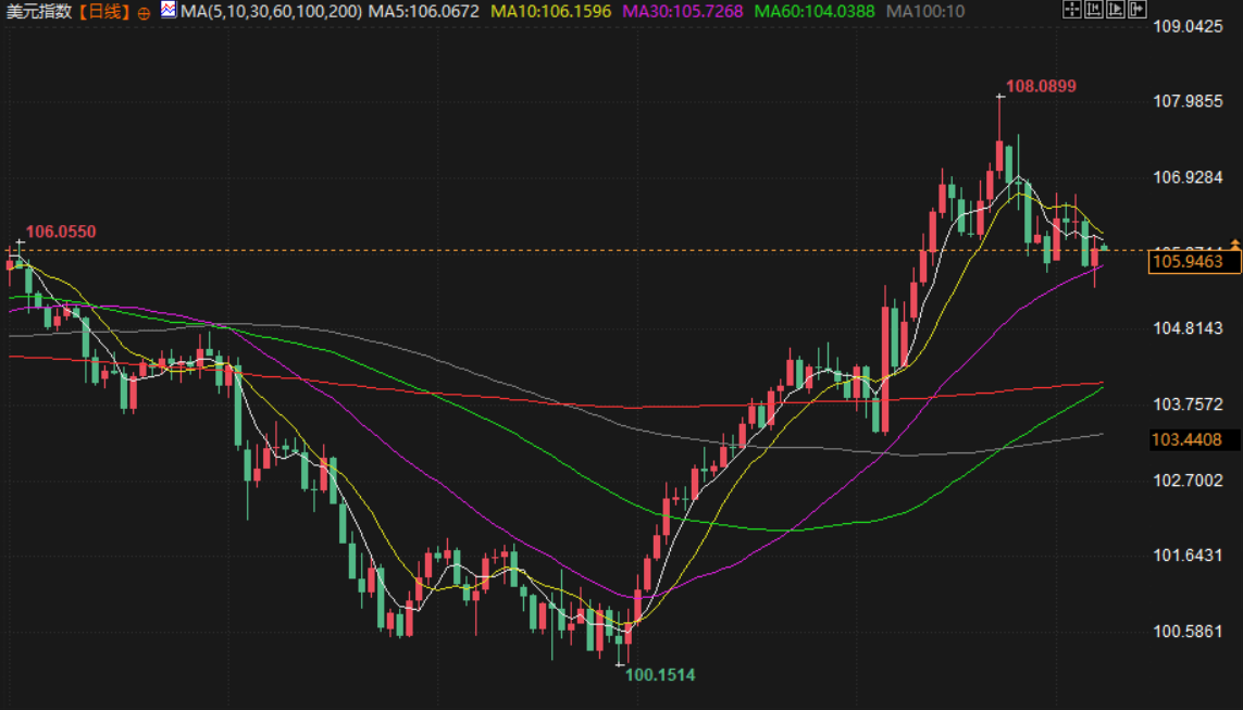 美元指数 攀升 0.3%,至 106 ,此前一个交易日曾跌至三周最低,