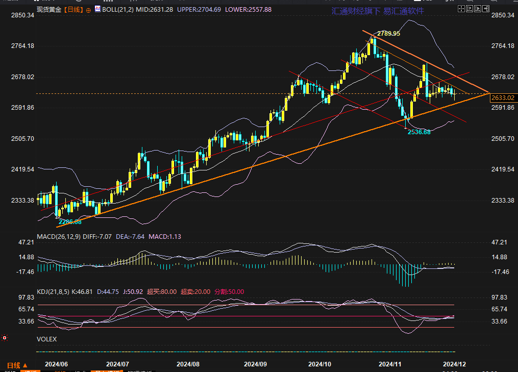 上周(1202-1206当周),金价持续横盘,周线收跌0.65%收报2633.02美元/盎司,整个一周仅波动了44美元,为近15周(8月30日当周以来)最窄幅波动。在地缘冲突有希望停火而又在停火协议谈判中发生激烈冲突、美联储放言12月不降息而非农后市场对美联储12月降息的预期又升温,这两个影响黄金的关键基本面因素都在弹皮球,金价也没有寻找到明确的交易方向。技术面的整理区间还没破位。