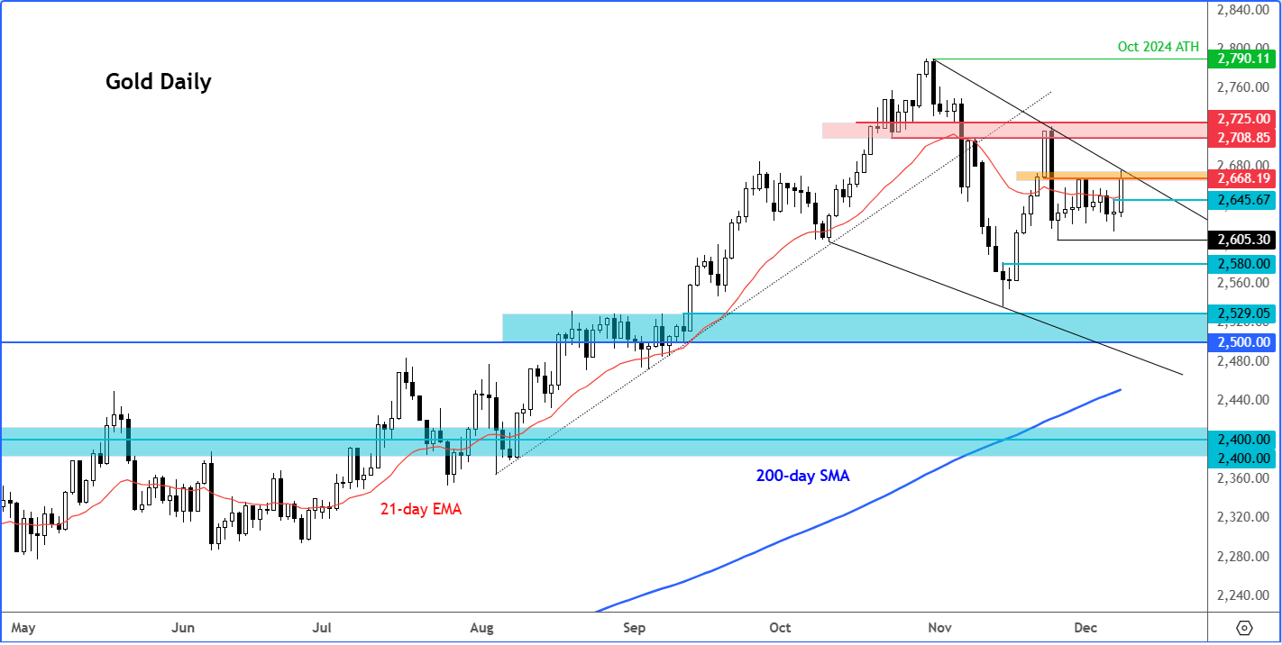 初始阻力位在2668- 2670美元:标志着楔形形态的看跌趋势,收盘价高于该区域可能预示着看涨反转。
