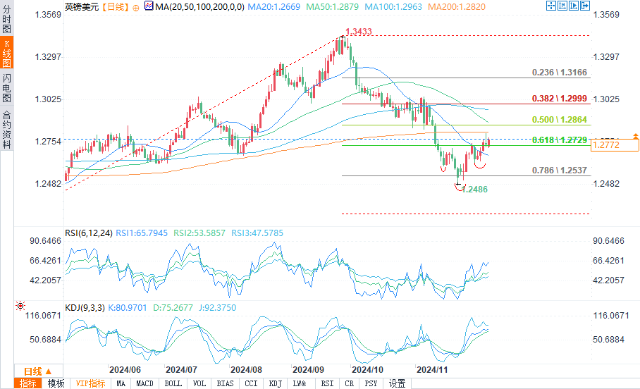 美元反弹后,英镑/美元回撤至4月至9月上升趋势的0.786斐波纳契水平1.2487,形成3波修正形态(艾略特波浪理论中的ABC)。英镑/美元已经从1.2487低点反弹,可能形成一个倒头肩底形态。然而,确认需要突破颈线1.2770。